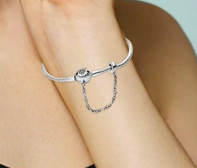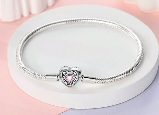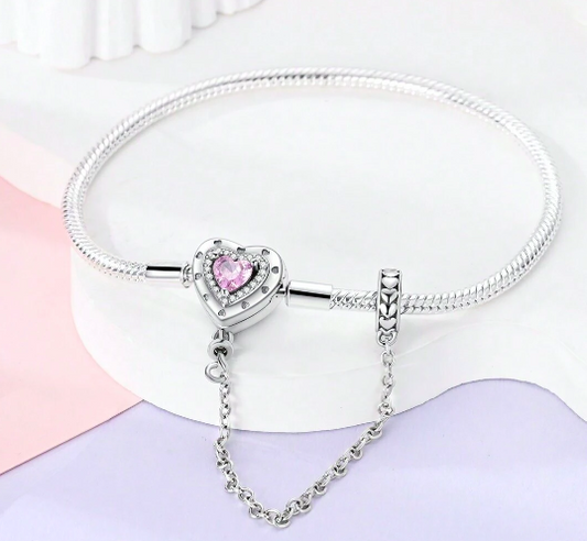 Pulsera de Cadena de Serpiente Corazón Cristal Rosa y Brillantes con cadena de seguridad